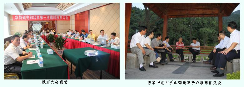 7月25日上午,在沂山東鎮御苑酒店四樓會議室召開華特磁電2010年第一次臨時股東大會。公司的8位法人股東、8位自然人股東出席本次會議,代表公司4500萬股,占公司股本的100%。會議由公司董事長王兆連先生主持,公司職工董事、監事及部分核心高管列席了會議。