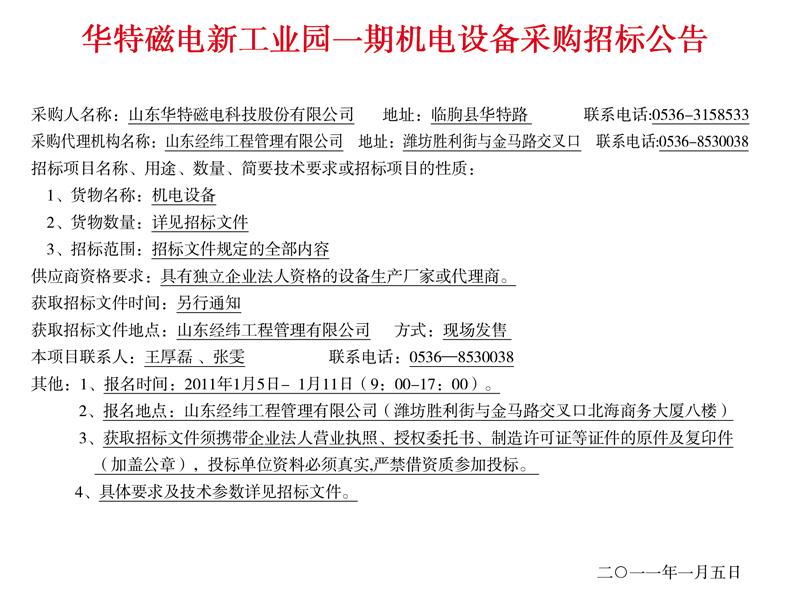 華特磁電新工業(yè)園一期機電設備采購招標公告