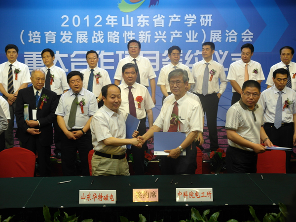 6月1日,山東省產學研(培育發展戰略性新興產業)展洽會在濟南召開。在其重大合作項目簽約儀式上,公司與中科院電工所簽訂了“蒸發冷卻立環高梯度磁選機的研制”技術開發合同。公司董事長兼總經理王兆連與電工所顧國彪院士分別代表雙方在合同上簽字。這也是繼2004年雙方聯合研制蒸發冷卻電磁除鐵器后的又一次合作,主要是利用蒸發冷卻介質的良好導熱性解決立環磁選機勵磁線圈的溫升問題,提高磁感強度。該項目研發成功后,其背景場強可達1.5特斯拉,主要解決目前常規立環不能解決的難選礦的選鐵和高純石英、鉀鈉長石等非金屬礦加工的鐵雜質提純等難題。省委副書記、副省長王軍民和濰坊市副市長潘強等省市領導參加了簽約儀式。