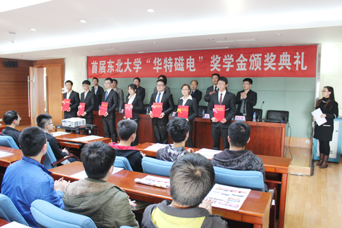 典禮首先由韓躍新宣布獲獎學生名單,之后分別由各位公司領導和院校領導為獲得獎學金的本科生和研究生頒獎。獲獎學生代表雷洋發言,表達了華特磁電公司設立獎學金的感激之情,同時表示他們一定會再接再厲,取得更加優異的成績。李鶴主任代表張學良教育基金會為王兆連董事長頒發了捐贈證書。隨后,王董事長向大家簡單介紹了公司的工作方向、發展前景以及設立獎學金的意義。最后,王立慧書記向所有獲獎學生表示祝賀,并代表學院感謝我公司設立獎學金幫助學生成長成才,希望全體獲獎學生學會感恩,回報社會。